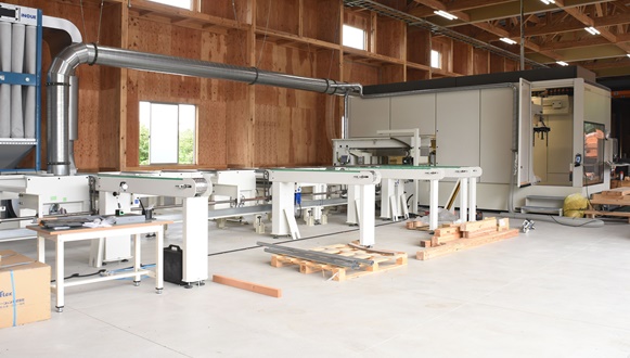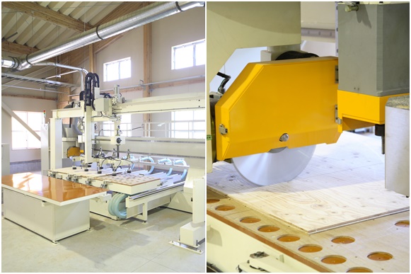 旋回、傾斜を含む5軸NC加工マシンにより、登り梁や斜材の加工、通常ラインで加工できない平柱などの加工が可能 |